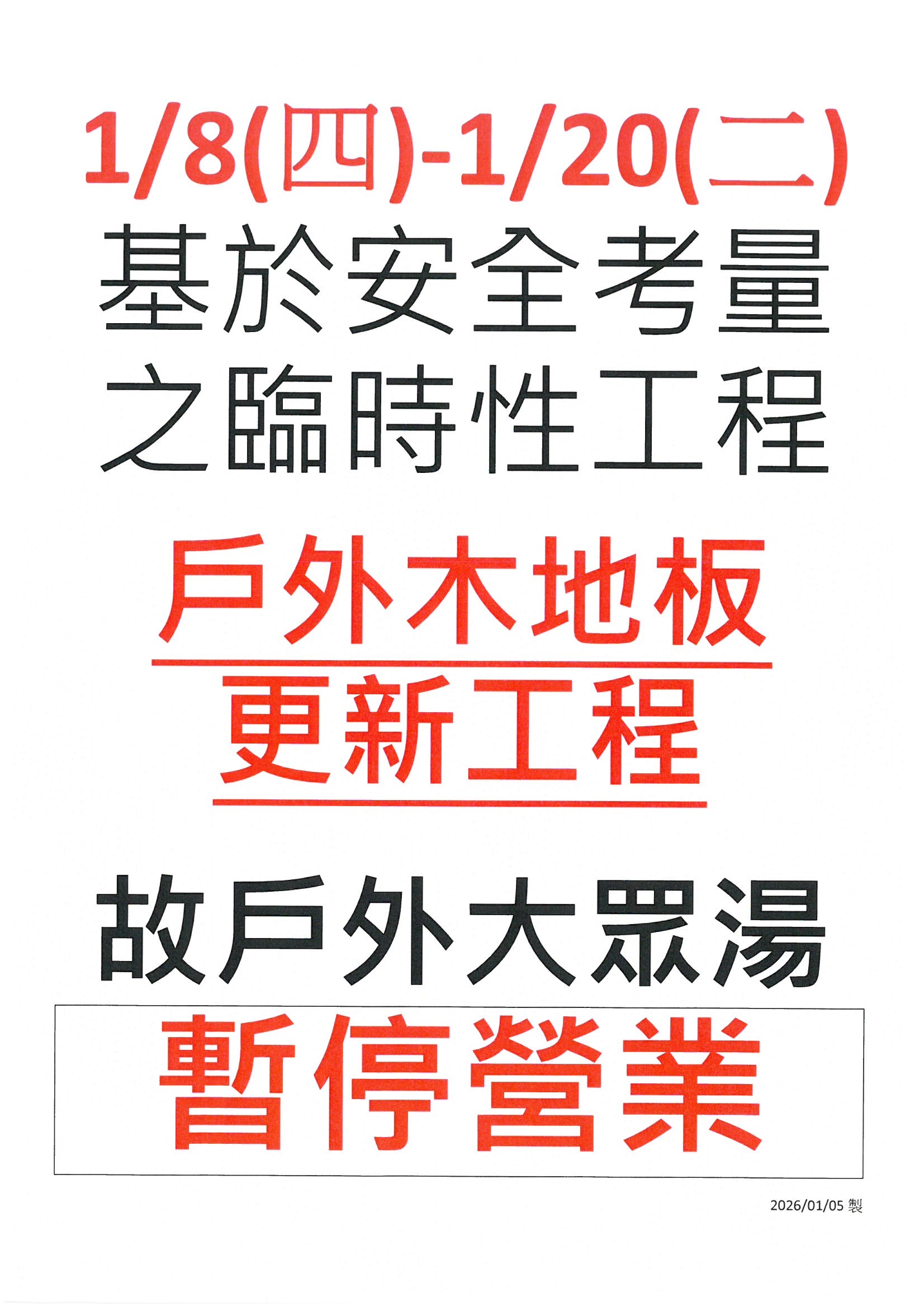 1/8-1/20戶外松溪大眾湯施工,暫停營業