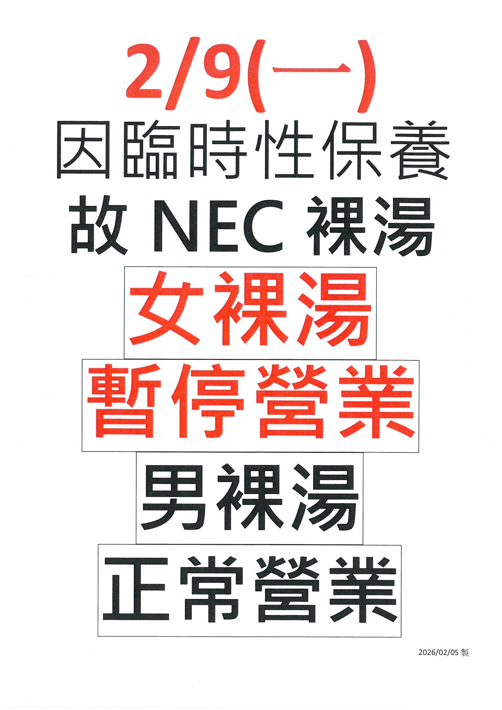 2/9NEC裸湯營業時間調整公告
